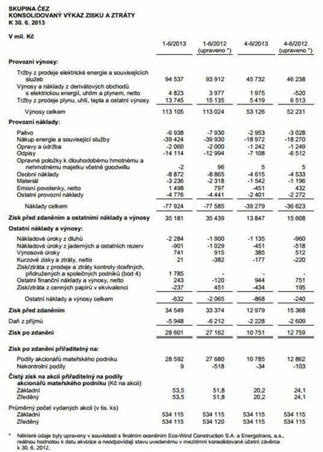 Aktualizováno (11:40): Výsledky ČEZ - za 2Q2013 Čistý zisk 10,75 miliardy Kč (odhad 11 miliard), za 1H2013 28,6 miliardy Kč (odhad 28,9 miliardy). Pololetní provozní zisk před odpisy (EBITDA) se meziročně zvýšil o 0,9 miliardy Kč (1,9 %) a dosáhl 49,2 miliardy Kč. Výsledky komentuje analytik ČS Petr Bártek.