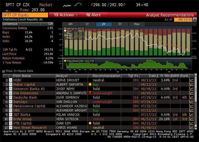 HSBC snižuje cílovou cenu na Telefóniku C.R. z 290 Kč na 283 Kč, doporučení zůstává neutrální Redakce IW13. 8. 2013 | 9:10O2 Czech Republic (dříve Telefónica C.R.)Zdroj: BloombergPodívejte se na aktuální videoInvestiční doporučeníO2 Czech Republic (dříve Telefónica C.R.)Redakce IW Další články autoraTOP 10 článků týdne: Udýchaný akciový býk, další velký SHORT a výhledy pro zlato a bitcoinOčekávané výsledky světových firem v týdnu od 17. listopadu: NVIDIA, Walmart, Colt CZ GroupTOP 10 článků týdne: Investiční tipy, Moskva vůči Pekingu a AI pokaždé jinak DoporučujemeAI euforie žene index S&P 500 do extrémů. Bank of America radí, kam teď "schovat" penízeDiverzifikace investicPříští vláda shrábne makroekonomický jackpotČeská ekonomikaDvě fakta o velkých akciových propadech, která vás možná překvapíSvětové akcie Aktualitydnes | 10:00Chcete vědět, co čeká bitcoin? Sledujte Nasdaq!15. 11. | 15:00Zvýšená inflace není populární, je ale dobrou zprávou o české ekonomice15. 11. | 10:38Trump prý příští týden zažaluje BBC až o pět miliard dolarů15. 11. | 4:41Buffett nakoupil akcie Alphabetu a odprodal Apple. Tohle je deset největších pozic v portfoliu Berkshire Hathaway15. 11. | 1:11Trump reaguje na hrozbu růstu inflace, snižuje cla na dovoz některých potravin14. 11. | 22:30Americké technologické akcie v pátek ožily. V týdenním horizontu ale index Nasdaq Composite oslabil14. 11. | 18:00Evropským akciím se v pátek nedařilo. V týdenním horizontu ale hlavní indexy stouply14. 11. | 16:45Pražská burza v pátek oslabila, proti proudu šly akcie ČEZ, Philip Morris ČR a Kofoly14. 11. | 16:33Zlato v pátek oslabuje, investoři pochybují o prosincovém snížení sazeb Fedu14. 11. | 16:16Akcie StubHub zlevnily o 24 %, firma odmítla zveřejnit výhled na čtvrté čtvrtletí14. 11. | 15:49USA a Švýcarsko se dohodly na snížení cel na 15 procent14. 11. | 15:40Americké akcie v úvodu: Dow -1,02 %, S&P 500 -0,70 %, Nasdaq 100 -0,69 %Zobrazit všechny aktuality