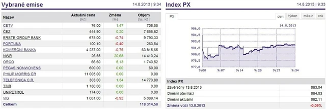 Pražská burza v úvodu mírně ztrácí. Index PX -0,1 % Redakce IW14. 8. 2013 | 9:36Akcie ČRZdroj: BCPPAktualita pro rok 2026Akcie ČRRedakce IW Další články autoraTOP 10 článků týdne: Kvantový průšvih, Santa a výhled pro zlatoCo vás na Investičním webu v poslední době možná minuloTOP 10 článků týdne: IPO SpaceX, akciová nejistota a OpenAi pálící miliardy DoporučujemeŠokující předpověď na rok 2026: Kvantový skok nabourá krypto a destabilizuje světové financeVýhled na rok 2026Otestovali jsme AI jako investičního poradce. Takhle vám doporučuje v roce 2026 naložit s peněziInvestiční tipyŠokující předpověď na rok 2026: Volby do amerického Kongresu proběhnou hladce, politická i společenská realita se začne měnitVýhled na rok 2026 Aktuality31. 12. | 22:30Americké akciové indexy za rok 2025 sčítají vysoké zisky. Poslední prosincová seance pro ně ale byla ztrátová31. 12. | 18:00Evropské akcie v poslední prosincové seanci oslabily, celý rok ale pro ně byl výrazně ziskový31. 12. | 15:45Zlato a stříbro na silvestra zlevňují, investoři vybírají zisky po mimořádně silném roce31. 12. | 15:35Americké akcie v úvodu: Dow -0,15 %, S&P 500 -0,13 %, Nasdaq Composite -0,12 %31. 12. | 14:42USA: Počet nových žádostí o podporu v nezaměstnanosti v týdnu do 27. prosince klesl na 199 tisíc31. 12. | 14:35Futures na americké akcie: Dow -0,07 %, S&P 500 -0,07 %, Nasdaq 100 -0,11 %31. 12. | 12:47Fed podle průzkumu může během roku nakoupit dluhopisy za 220 miliard dolarů31. 12. | 12:23Čína omezí dovoz hovězího masa a zavede 55% clo na objemy nad kvóty31. 12. | 11:40Šampaňské slaví Nový rok, odvětví ale čelí clům a reputačním problémům31. 12. | 11:20Dnes končí éra Warrena Buffetta v čele Berkshire Hathaway31. 12. | 10:52NVIDIA jedná s TSMC o čipech H200 pro čínský trh, uvádějí zdroje31. 12. | 10:36Asijské trhy zakončily poslední obchodní den roku v červených číslechZobrazit všechny aktuality