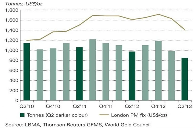 Celosvětová poptávka po zlatě se ve druhém čtvrtletí propadla na čtyřleté minimum kvůli poklesu zájmu ze strany investorů a centrálních bank. Poptávka po zlatých špercích však prudce stoupla díky nižším cenám. Oznámilo to ve středu sdružení předních těžařů zlata World Gold Council. Čistá poptávka po žlutém kovu ve čtvrtletí meziročně klesla o 12 % na 856 milionů tun, tedy na nejnižší úroveň od roku 2009. Nákupy zlata ze strany centrálních bank se snížily téměř o 60 %. Investoři navíc stahovali své peníze z fondů založených na zlatě.