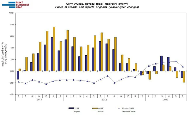 V červnu 2013 vývozní ceny meziměsíčně klesly o 0,9 %, dovozní ceny o 1,0 %. Meziročně se vývozní ceny snížily o 1,1 %, dovozní ceny o 1,9 %. Směnné relace meziměsíčně dosáhly hodnoty 100,1 %, meziročně 100,8 %.