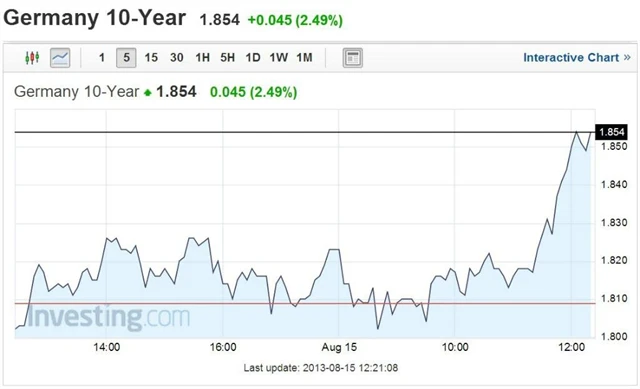 Výnos německých desetiletých státních dluhopisů stoupá na 1,854 %, nejvýše od dubna 2012 Redakce IW15. 8. 2013 | 12:07Německé státní dluhopisyZdroj: BloombergNěmecké státní dluhopisyRedakce IW Další články autoraTOP 10 článků týdne: Investiční tipy, Moskva vůči Pekingu a AI pokaždé jinakOčekávané výsledky světových firem v týdnu od 10. listopadu: Walt Disney, Cisco Systems, RWE, ČEZJak vydělat na jednorožcích dříve, než se na ně vrhnou investoři na burze DoporučujemeNestihli jste naskočit do zlaté rally? Vůbec není pozdě, říká stratégZlatoRychlé peníze ve velkém opustily zlato a stříbro. Trh se připravuje na další růstZlatoAI euforie žene index S&P 500 do extrémů. Bank of America radí, kam teď "schovat" penízeDiverzifikace investic Aktualitydnes | 15:14Grab přirovnávaný k "asijskému Uberu" investuje do dálkového řízení vozideldnes | 14:53Microsoft propaguje Copilot přes influencery, míří na běžné uživatelednes | 14:28Americké akcie v úvodu: Dow +0,16 %, S&P 500 +0,13 %, Nasdaq Composite -0,21 %dnes | 14:18Suezský průplav hlásí první známky oživení, dopravci zvažují návratdnes | 14:00eToro těží z návratu retailu, zisk překonal odhadydnes | 13:45Futures na americké akcie: Dow +0,37 %, S&P 500 +0,91 %, Nasdaq 100 +1,45 %dnes | 13:00Japonští investoři objevují Evropu, láká je rozmach pokročilých technologiídnes | 12:35Zpomalení tržeb TSMC vyvolává otázky o udržitelnosti růstu sektoru umělé inteligencednes | 12:15Investiční sentiment v eurozóně znovu klesá, výhled zůstává slabýdnes | 11:45Bank of England zmírňuje postoj ke stablecoinůmdnes | 11:22Odvolací soud odmítl žádost Trumpovy administrativy o zastavení výplaty dávek SNAPdnes | 11:04Colt CZ Group zveřejnila pozvánku na valnou hromadu k hlasování o vydání akcií Zobrazit všechny aktuality Nejčtenější tento týden1.Nestihli jste naskočit do zlaté rally? Vůbec není pozdě, říká stratég2.Rychlé peníze ve velkém opustily zlato a stříbro. Trh se připravuje na další růst3.AI euforie žene index S&P 500 do extrémů. Bank of America radí, kam teď "schovat" peníze4.Příští vláda shrábne makroekonomický jackpot5.Dvě fakta o velkých akciových propadech, která vás možná překvapí6.Bank of America varuje: Americké akcie působí zdravě, ale trh uvnitř hnije Sledujte násinvesticniweb.cz14000Investiční web19300LIVE2300Investiční web1000investicni_web500Investicniweb.cz33600