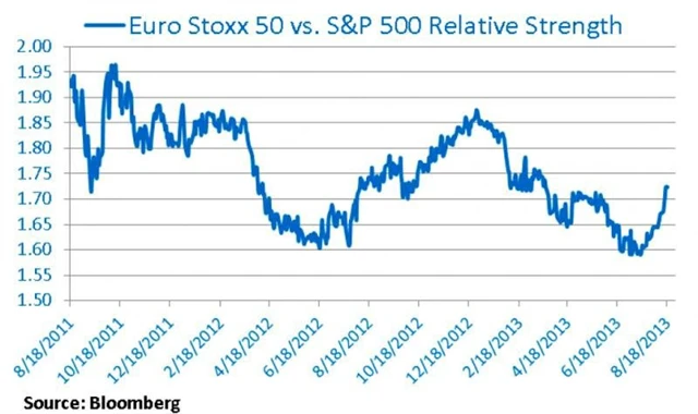 Konec recese, předchozí horší výkonnost ve srovnání s japonským a americkým trhem a zaostávání těchto trhů po dosažení mnohaletých maxim - to jsou hlavní důvody relativní síly evropských akcií. Graf srovnání indexů DJ EuroStoxx 50 a S&P 500 sestavil Mike O'Rourke z JonesTrading.