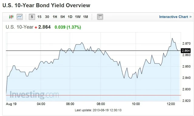 Výprodej vyhnal výnos desetiletých státních dluhopisů na 2,875 % v pondělí kolem poledne, nejvýše od roku 2011.