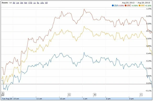 Dow po závěrečném poklesu nakonec oslabil o 0,05 % na 15 002,99 bodu, širší S&P 500 uzavřel se ziskem 0,38 % na 1 652,35 bodu a technologický Nasdaq posílil o 0,68 % na 3 613,59 bodu. Nejvíce se dařilo sektoru služeb a titulům ze sektoru cyklického spotřebního zboží. Nejslabší výkonnost předvedly telekomunikační tituly a sektor necyklického spotřebního zboží.