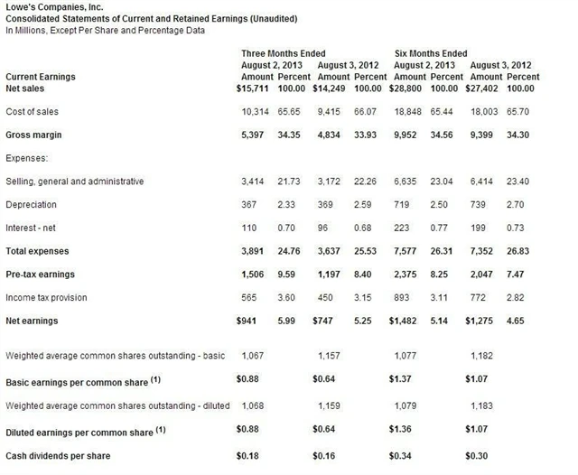 Výsledky Lowe's 2Q2013: Zisk na akcii 0,88 USD (odhad 0,79 USD), tržby: 15,71 miliardy USD (odhad: 15,07 miliardy USD)