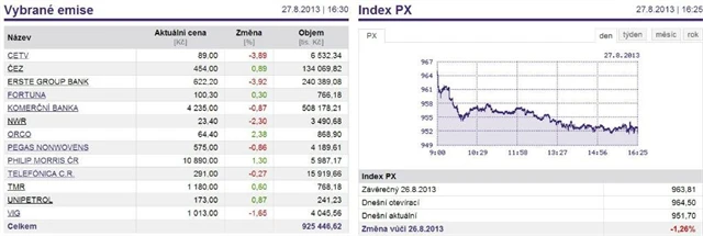 Akciím na pražské burze se v úterý příliš nedařilo. Index PX odepsal 1,26 % na 951,70 bodu.