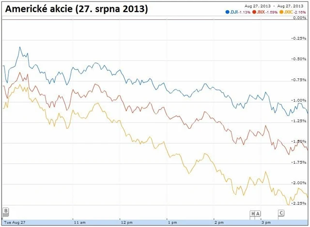 Americké akcie v úterý výrazně odepisovaly kvůli rostoucímu napětí v Sýrii a zažily od června nejhorší denní pokles. Podle nejmenovaného zdroje televizní stanice CNBC by raketový útok Spojených států na Sýrii mohl přijít již ve čtvrtek. Nervozitu investorů zvyšuje také blížící se dosažení dluhového stropu. Podle amerického ministerstva financí Jacka Lewa by se Spojené státy mohly do platební neschopnosti dostat již v polovině října.