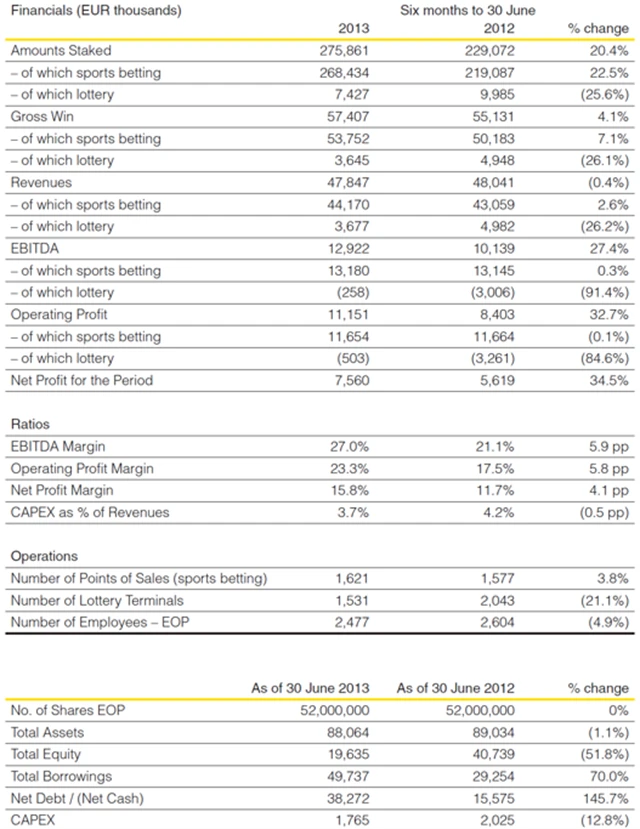 Hrubé výhry vzrostly meziročně o 4,4 % na 57,4 milionu eur. Zisk EBITDA v prvním pololetí vzrostl o 27,4 % na 12,9 milionu eur. Čistý zisk vyskočil o 34,5 % na 7,56 milionu eur. Objem sázek vzrostl o 20,4 % na 275,9 milionu eur. I tak ale společnost zaostala výsledky za odhady analytiků.