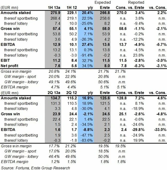 Největší sázková společnost ve střední Evropě Fortuna Entertainment Group v prvním pololetí roku 2013 přijala sázky v celkové výši 275,9 milionu EUR, což je o 20,4 % více než ve stejném období předchozího roku. EBITDA společnosti (provozní zisk před odpisy, úroky a korporátní daní) vzrostl na 12,9 milionu EUR, co je o 27,4 % více než v prvním pololetí roku 2012. Hrubá výherní marže ovšem klesla na 20 %, před rokem byla 22,9 %.
