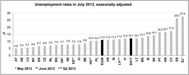 Nejnižší míry nezaměstnanosti zaznamenalo Rakousko (4,8 %), Německo (5,3 %), Lucembursko (5,7 %) a nejvíce nezaměstnaných žije v Řecku (27,6 % v květnu) a Španělsku (26,3 %). Ve srovnání s loňským rokem nezaměstnanost rostla v sedmnácti zemích EU a v jedenácti klesla.