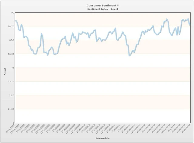Index spotřebitelské důvěry Michiganské univerzity v srpnu klesl z 85,1 bodu na 82,1 bodu (flash: 80 bodů)