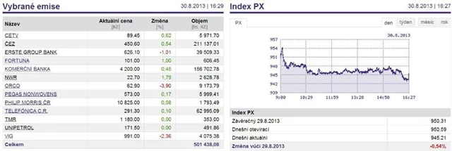 Pražská burza zakončila srpnové obchodování v mínusu. Index PX odepsal 0,54 % a uzavřel letní prázdniny na 945,21 bodu. Za celý týden ztratil 2,35 %.