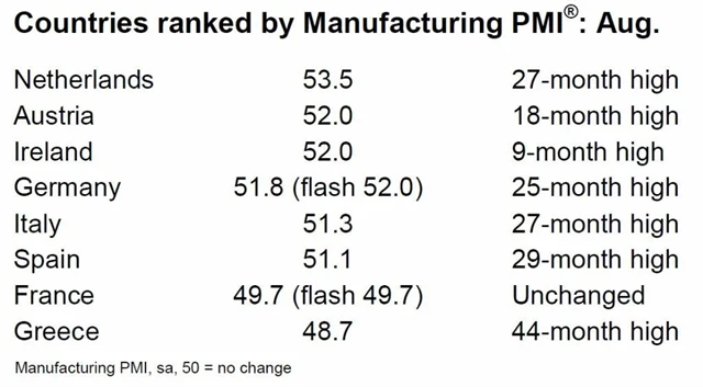Ze všech členů eurozóny se v srpnu pod neutrální hranicí 50 bodů pohybovaly pouze průmysl Francie a Řecka. Průmyslová výroba, nové objednávky a export zrychlily dokonce nejvíce od května 2011, což dokazuje pokračující ekonomické oživení starého kontinentu.