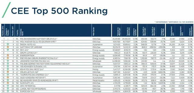 Česko vykazuje největší průměrný obrat na jednu firmu. Většina klíčových hráčů z regionu opět pochází Polska, které má v 500 více než třetinu firem. Většinu firem v žebříčku Coface CEE Top 500 opět pochází z ropného sektoru. Na druhém místě je energetický průmysl. Z českých firem byly nejúspěšnější Škoda Auto, která se posunula o jednu příčku na třetí místo, pátý ČEZ a 21. Unipetrol.