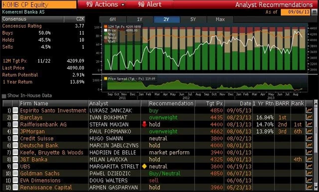 "U Komerční banky postrádáme výraznější faktory, které by cenu akcií ovlivňovaly, valuace jsou vysoké, zisky jsou pod tlakem. Pokles cen akcií může nabídnout příležitost hrát tento defenzivní příběh a užít si vysoký dividendový výnos," píší o Komerční bance analytici z HSBC.