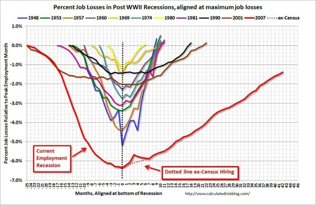 Zotavování amerického trhu práce pokračuje, jak ovšem ukazuje níže uvedený graf, je nejpomalejší ze všech velkých krizí v americké historii.
