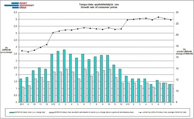 Spotřebitelské ceny klesly v srpnu proti červenci o 0,2 %. Tento pokles ovlivnilo zejména snížení cen v oddíle potraviny a nealkoholické nápoje. Meziroční růst spotřebitelských cen zpomalil v srpnu na 1,3 % (z 1,4 % v červenci).