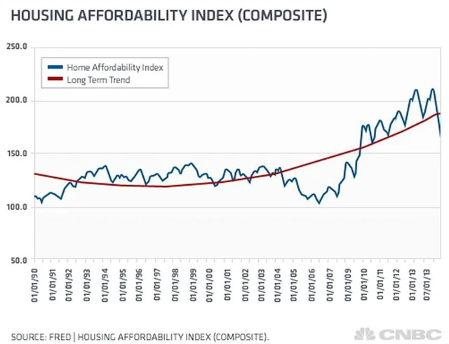 Hladina indexu vrcholila v lednu na 210,7 bodu, pak prudce klesala a v červenci dosáhla 157,8 bodu (podle předběžných údajů zveřejněných v pondělí). Ceny domů i hypotéční sazby rostou, zatímco příjmy domácností nedrží krok. To je důvod, proč se index ocitl na nejnižší hodnotě od července 2009. Domy se tak stávají méně dostupnými.