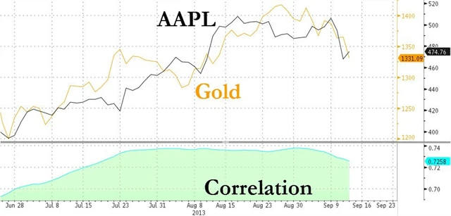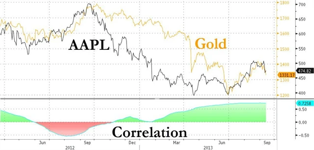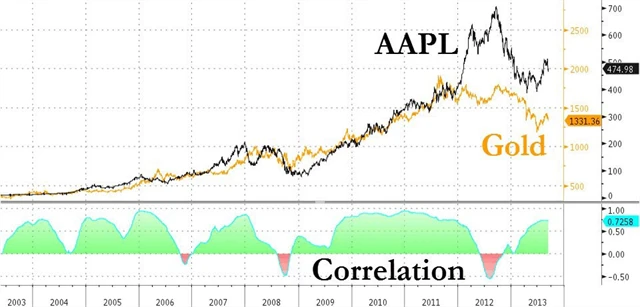 Falešná korelace? Možná! Nicméně za období 10 let, 2 měsíců a 2 týdnů jsou si grafy akcií Applu a spotové ceny zlata podezřele podobné!