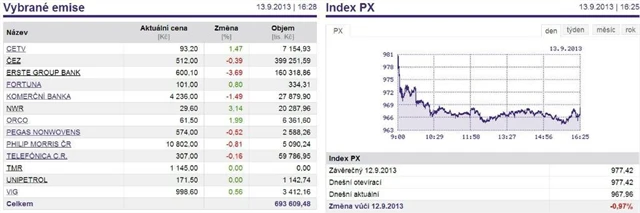 Index PX v pátečním obchodování odepsal 0,97 % na 967,96 bodu. Dolů ho stáhly především bankovní tituly. Pražská burza ale v týdnu posílila o 2,17 %.