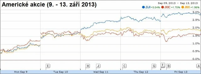 Americké akcie v pátek posílily. Dow díky tomu zaznamenal nejprudší týdenní nárůst od ledna. Pozornost trhu se nyní soustředí na blížící se zasedání americké centrální banky, pokračují také jednání o odvrácení ozbrojeného zásahu USA v Sýrii.