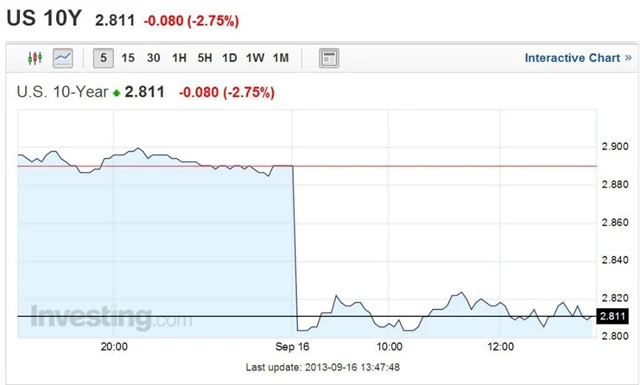 Po zveřejnění zprávy o tom, že Lawrence Summers nebude kandidovat na šéfa Fedu, výnos amerických desetiletých státní dluhopisů prudce klesl na hladinu za začátku září.