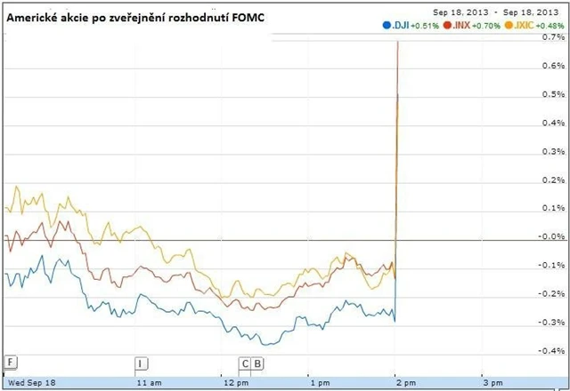 Index S&P 500 po zveřejnění rozhodnutí vyletěl na nové historické intradenní maximum a Dow ho rychle následoval. Nahoru vyletěla i cena zlata. Začala růst těsně před oznámením FOMC, následně vystřelila vzhůru.