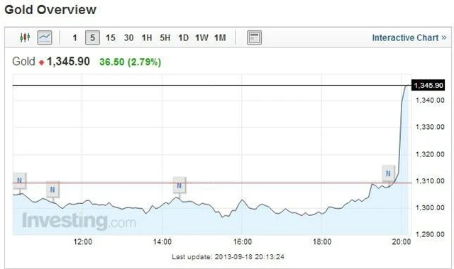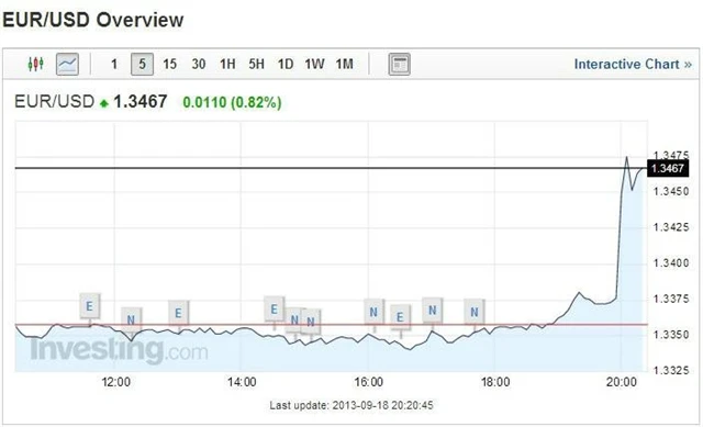 Americká centrální banka na svém zářijovém zasedání rozhodla o zachování tempa nákupu dluhopisů, bude tedy nadále nakupovat dluhopisy za 85 miliard dolarů měsíčně. Chce počkat, až bude oživení ekonomiky stabilnější. Fed zároveň zhoršil výhled ekonomiky. Americké burzy zareagovaly okamžitou explozí, indexy vystřelily nahoru, stejně jako cena zlata. Tiskovou konferenci Bena Bernankeho jsme sledovali živě.