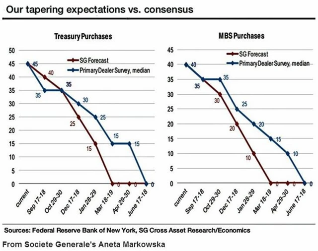 Od doby, kdy Fed začal naznačovat, že exit může přijít na podzim, ekonomové odhadují, v jak velkém rozsahu nákupy aktiv omezí. Nejdříve předpokládali 15 miliard USD (nákupy dluhopisů o 10 miliard a hypotéčních aktiv o 5 miliard). Vzhledem k horším než očekávaným makrodatům v posledních týdnech řada z nich své původní odhady snížila. V průměru tak počítali s omezením o 5 až 10 miliard, a to jak nákupů dluhopisů, tak hypotéčních aktiv.