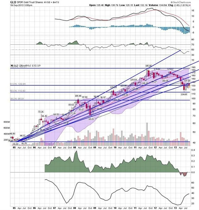 Měsíční graf ceny zlata je stále hodně medvědí. Cena prolomila svůj mnohaletý růstový trend již v prvním pololetí a propadla se k 50% Fibonacciho úrovni z předchozí rally. Ta se při růstu z uplynulých dnů (po zasedání FOMC) ukázala být silnou rezistencí.