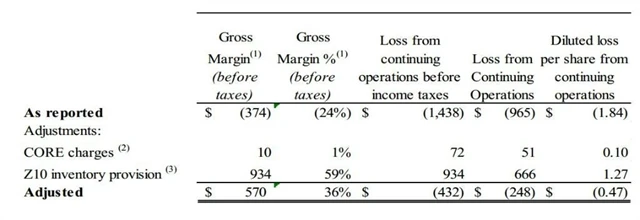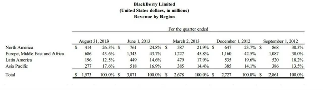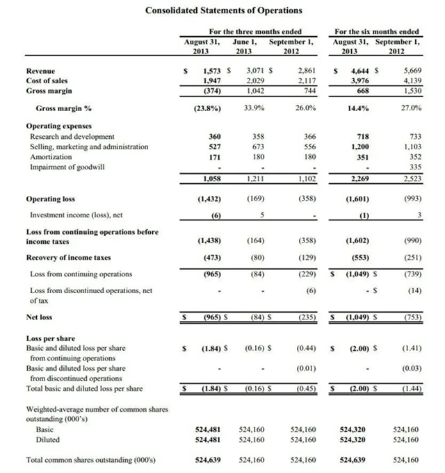 Nejenže firmě oproti předchozímu kvartálu klesly tržby na polovinu, ale reportovala dokonce zápornou hrubou marži 23,8 % v důsledku nákladů na uvedení nového modelu BlackBerry Z10 na trh. Po očištění o tyto položky dosáhla marže 570 milionů dolarů.