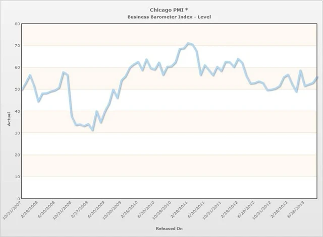 Index nákupních manažerů pro oblast Chicaga v září vyskočil na 55,7 bodu ze srpnových 53 bodů (odhad: 54 bodů)