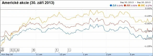 Americké burzy v pondělí oslabovaly. Investoři se báli, že se politici do pondělní půlnoci na rozpočtu nedomluví a vláda spadne do platební neschopnosti. Všechny sektory indexu S&P 500 ztrácely, nejhlouběji se propadly energetický sektor a finanční služby.