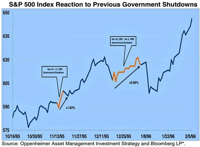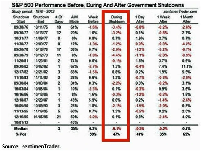 - Pro akcie nemusí být "odstávka" vládního provozu špatnou zprávou, jak ukazují dva poslední příklady. Oba jsou ale hodně "vousaté" a došlo k nim za zcela jiných podmínek. Nicméně panika zatím na trhu nepanuje. Tabulka níže ukazuje, že například měsíc po obnovení financování se většinou akcie dostanou do plusu, mnohdy ale jejich ceny rostou i během samotné platební neschopnosti americké vlády.