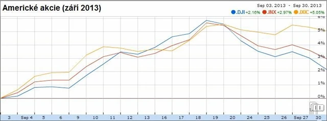 Po prázdninách se americké akcie vrátily na rekordy, zažily několik týdnů růstu v řadě, Apple představil nový iPhone a Facebook se vyšplhal 50 USD za akcii. Nejlépe se dařilo právě technologickým společnostem sdruženým v indexu Nasdaq. Nervozita ohledně financování vlády je dominantním tématem posledních dnů, v polovině října je termín pro navýšení dluhového stropu.