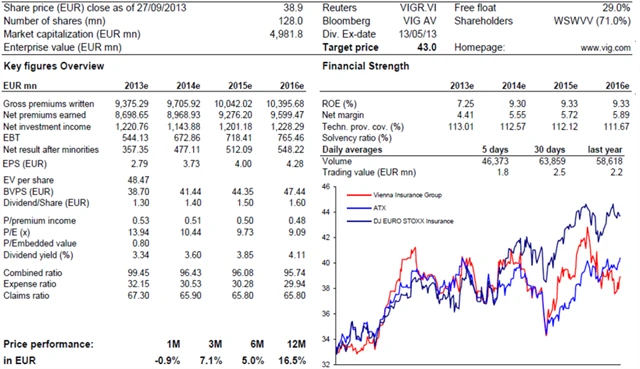 - Doporučení sníženo na "akumulovat": Potvrzujeme pozitivní pohled na akcie VIG, ale zároveň snižujeme doporučení z "kupovat" na "akumulovat". Především díky nárůstu vlastního kapitálu lehce zvyšujeme cílovou cenu ze 42 na 43 eur na akcii.