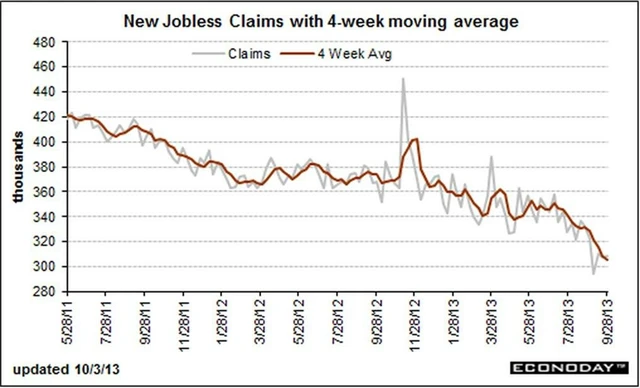 Počet nových žádostí o podporu v nezaměstnanosti v minulém týdnu vzrostl o pouhý tisíc na 308 tisíc. Analytici očekávali, že počet nových žádostí o podporu v nezaměstnanosti vzroste na 315 tisíc. Předchozí údaj byl revidován mírně výše na 307 z 305 tisíc. Počet pokračujících žádostí o podporu vzrostl v týdnu do 21. září na 2,925 milionu z 2,821 milionu v předchozím týdnu (revidováno z 2,823 milionu). Čtyřtýdenní průměr spadl o 3 750 na 305 tisíc (předchozí týden revidován na 308 750 z 308 tisíc), nejníže od května 2007.