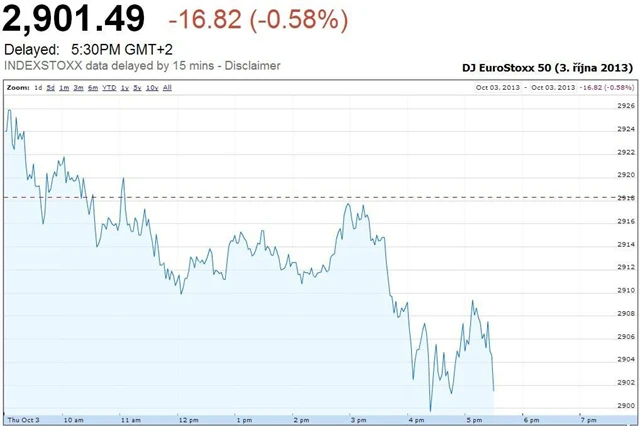Evropské akcie ve čtvrtek oslabovaly v reakci na probíhající diskuze o americkém rozpočtu a zprávě o tom, že aktivita v americkém sektoru služeb zpomalila více, než se čekalo.
