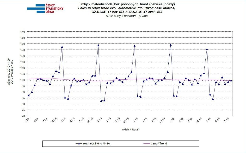 Sezónně očištěné tržby v maloobchodě včetně prodeje a oprav motorových vozidel se zvýšily v srpnu reálně meziměsíčně o 0,8 % a meziročně očištěné o vliv počtu pracovních dní vzrostly o 1,3 %. Bez očištění tržby klesly meziročně o 0,3 % při nižším počtu pracovních dní (-1). Celkový meziroční pokles byl ovlivněn snížením prodeje v samotném maloobchodě, naopak k jeho zmírnění přispěl růst v motoristickém segmentu.