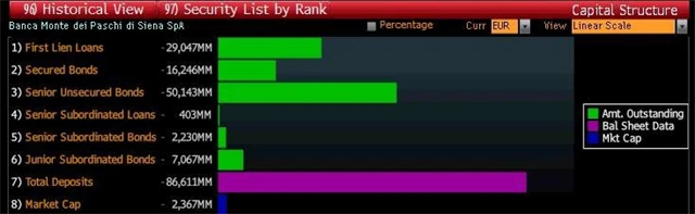 Plnohodnotný bail-in se už organizuje u nejstarší italské banky, která nutně potřebuje finance na rekapitalizaci. Kdo ztráty z odpisů v bance Monte Paschi utrpí? Nejspíše se na záchraně banky budou muset podílet držitelé senior dluhopisů a střadatelé. Podřízených dluhopisů je v kapitálové struktuře banky minimum.