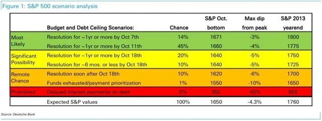 Deutsche Bank tomuto scénáři dává zatím nulovou pravděpodobnost. "Index S&P 500 pravděpodobně klesne někam k 1 650 bodům, pokud dohoda nebude do pátku na stole. Níže než na 1 625 by se propadnout neměl, pokud debata o dluhovém stropu úspěšně skončí do 17. října, kdy mají vládě dojít peníze," píše stratég David Bianco. "Několikatýdenní shutdown ukrojí něco z růstu HDP, ale i tak bude ekonomický růst i růst zisků firem slušný."