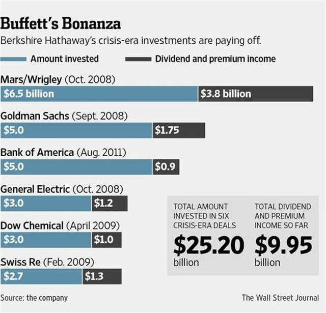 Zamrzlé úvěrové trhy v roce 2008 vedly k tomu, že si šest velkých firem došlo pro peníze k Buffettovi a jeho konglomerátu Berkshire Hathaway. Dohromady se jednalo o finanční pomoc v hodnotě přibližně 26 miliard USD.