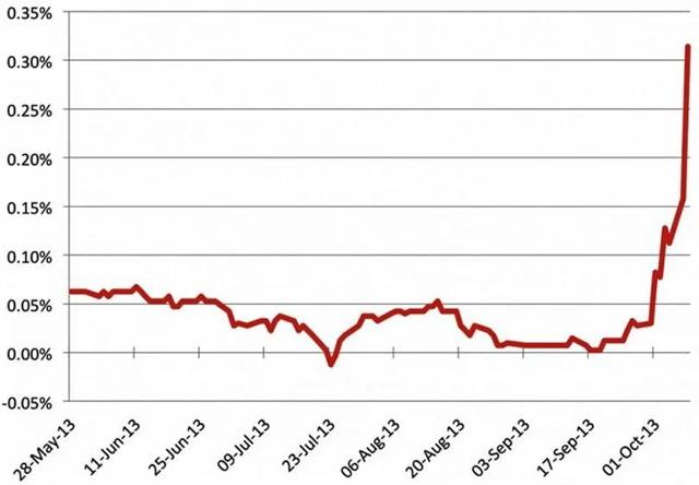 V aukci krátkodobých poukázek výnosy vzrostly nejvýše od roku 2008. Výnosy takzvaných "Halloween bills" v psoledních dnech jasně ukazují, jak roste nervozita na trhu, především s krátkodobým americkým dluhem.
