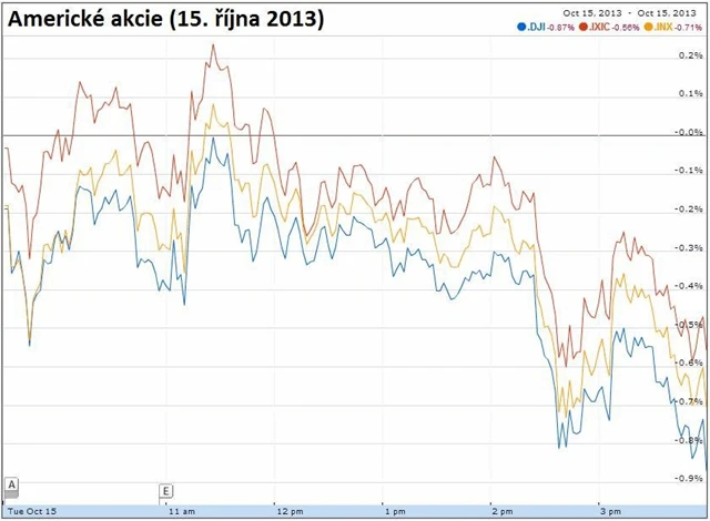 Americké akcie v úterý kolísaly. Zprvu je nahoru táhl optimismus investorů z blížící se dohody amerických zákonodárců o dluhovém stropu, následně však naděje uhasili republikáni ve Sněmovně reprezentantů, kteří přinesli vlastní návrh, který opět blokuje Obamacare, zásadní jablko sváru mezi oběma stranami. Ani dva dny před pravděpodobným dosažením dluhového stropu tak američtí politici společnou řeč nenašli a index volatility VIX poslali zpět k 19 bodům.