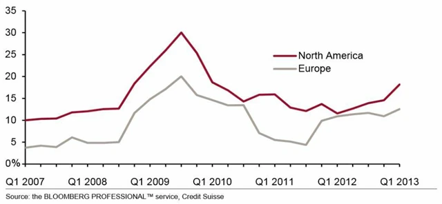 Současná situace je z pohledu úvěrového trhu podle Credit Suisse poměrně neobvyklá. Počet společností ve ztrátě tradičně koreluje s počtem firem v platební neschopnosti. Z celkového počtu společností, které v roce 2013 zveřejnily své čtvrtletní finanční výsledky, se jich do ztráty dostalo přibližně 18 %, v platební neschopnosti se jich však ve stejné době ocitlo pouze 2,8 %. "Počet společností v platební neschopnosti se pohybuje hluboko pod předpokládanou hodnotou 6 až 7 %," uvádí analýza.