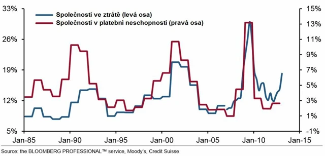 V srpnové zprávě analytici z Credit Suisse varují, že se na evropských i amerických trzích začínají nebezpečně rozevírat nůžky mezi počtem firem, které vykazují čtvrtletní ztrátu, a počtem firem, které se dostávají do platební neschopnosti. "V kontextu aktuálních událostí považujeme evropský i americký úvěrový trh za poměrně nestabilní," píše se v dokumentu.