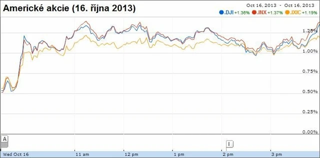 Index Dow přidal 1,36 % na 15 373,83 bodu, širší S&P 500 posílil dokonce o 1,38 % na 1 721,54 bodu a technologický Nasdaq narostl o 1,2 % na 3 839,43 bodu. Index volatility VIX ve středu spadl o 21,17 % na 14,71 bodu. Od začátku října S&P 500 přidal 2,38 %, i do úterý včetně byl v plusu, víra investorů v dosažení dohody se tedy podle všeho ukázala nebýt slepou.