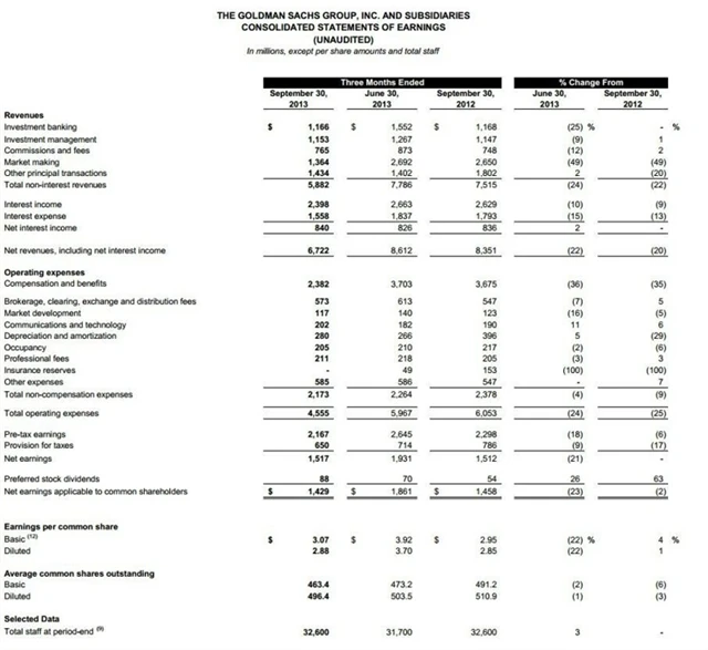 Zisk Goldman Sachs na akcii dosáhl 2,88 USD (odhad: 2,47 USD) a tržeb 6,72 miliardy USD (odhad: 7,35 miliardy USD). Zisk překonal očekávání analytiků, zatímco tržby za ním zaostaly. Banka zvyšuje čtvrtletní dividendu o 10 % na 55 centů.