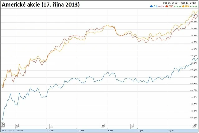 Americké akcie ve čtvrtek po silné středeční rally zahajovaly v mínusu, avšak takřka okamžitě začaly své ztráty mazat. Hrozba dosažení dluhového stropu byla krátkodobě odvrácena, a trhy se tak začínají plně soustředit na probíhající výsledkovou sezónu. Pouhé dvě akcie, IBM a Goldman Sachs, byly během dopoledne zodpovědné za ztrátu přes sto bodů indexu Dow, který se nakonec jako jediný nedokázal z červených čísel vymanit a uzavřel lehce pod nulou. Širší S&P 500 naopak posunul své intradenní i zavírací maximum.